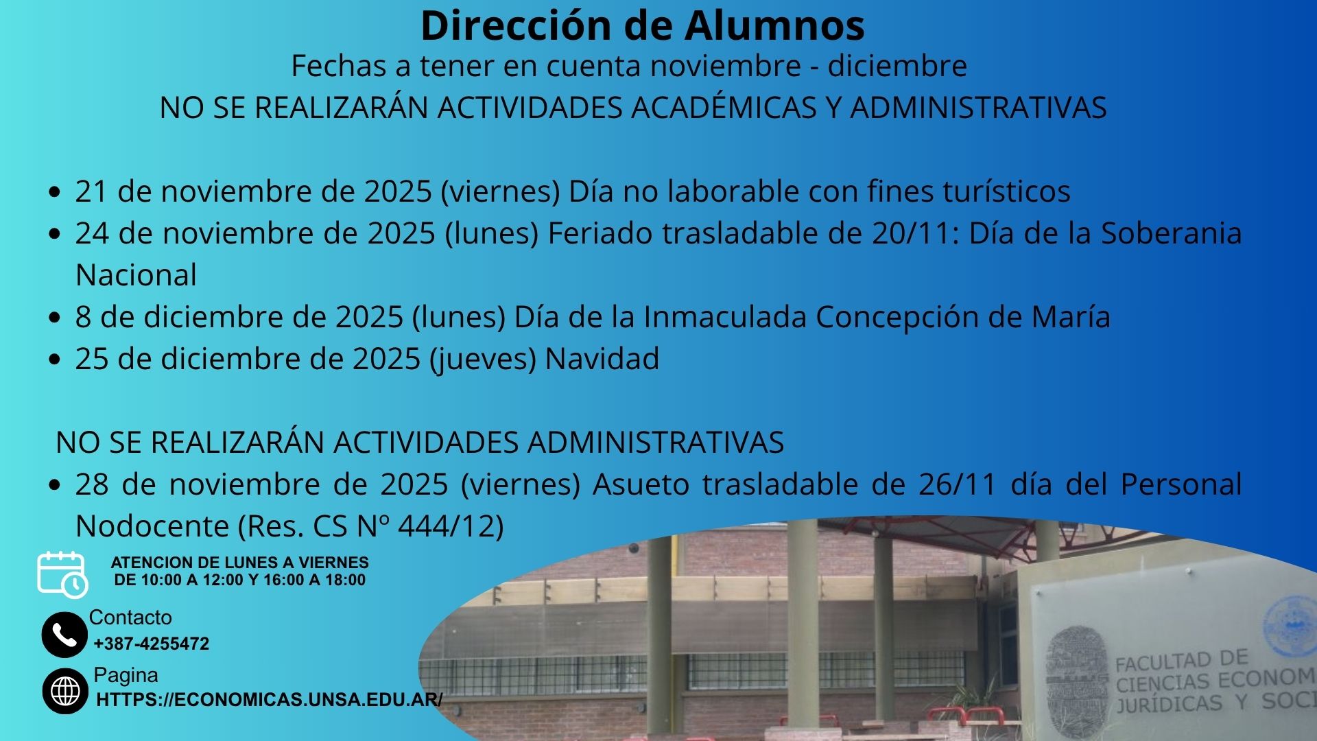 Se informa a toda la comunidad que el día 20 de noviembre de 2025, a las 21:00 horas, se realizará una fumigación general en el edificio de la Facultad.