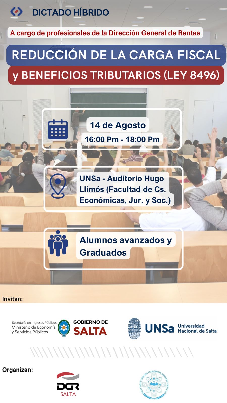La Secretaría de Investigación y Extensión invita a participar de la charla “Reducción de la Carga Fiscal y Beneficios Tributarios (Ley 8496)”, a cargo de profesionales de la Dirección General de Rentas, el miércoles 14 de agosto, de 16:00 a 18:00 horas, en el Auditorio Hugo Llimós de la Facultad de Ciencias Económicas, Jurídicas y Sociales (modalidad híbrida).