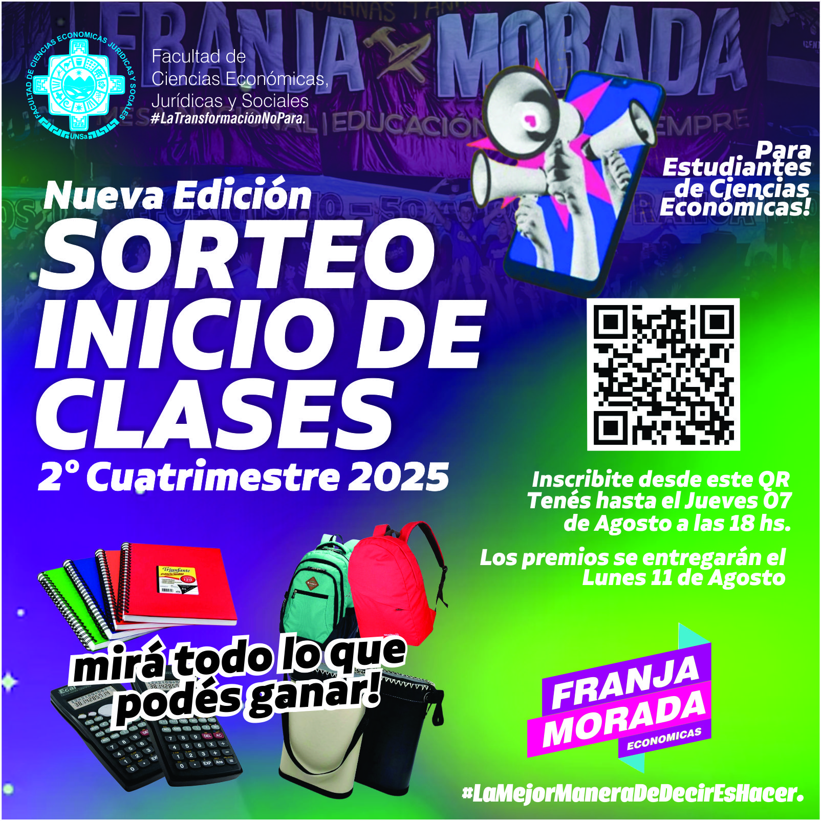 Desde la Franja Morada estamos impulsando un nuevo sorteo para el inicio de las clases del 2° cuatrimestre destinado al conjunto de los estudiantes de nuestra Facultad.