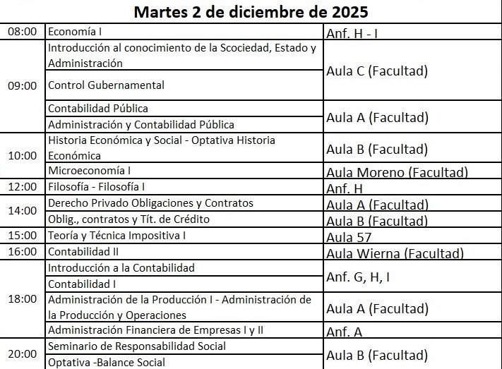 | 15:00 | Contabilidad IV | Moreno - Wierna (Facultad) |