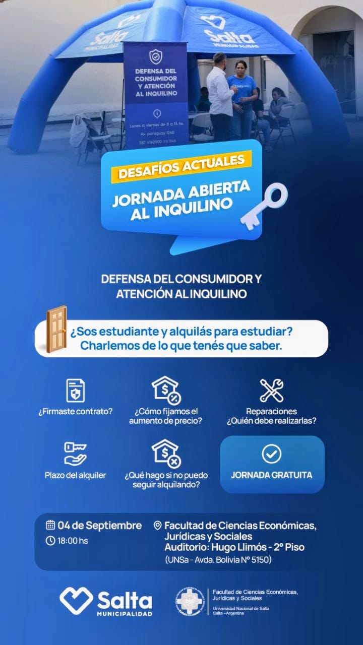 Los invitamos a participar de la Jornada Abierta al Inquilino – Desafíos actuales, organizada por la Defensa del Consumidor y Atención al Inquilino de la Municipalidad de Salta, con el acompañamiento de nuestra Facultad.