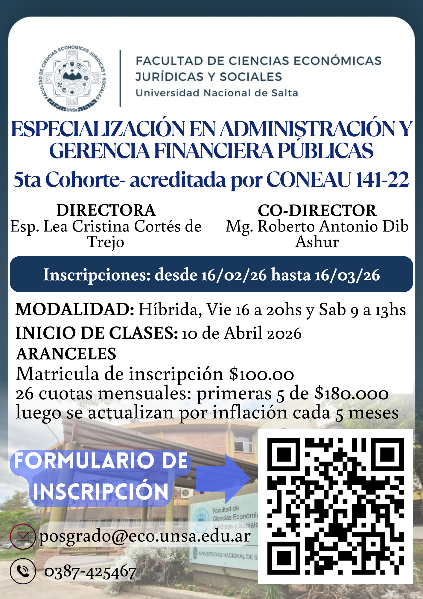 Desde la Dirección de Posgrado de la Facultad de Ciencias Económicas, Jurídicas y Sociales de la UNSa, invitamos a Contadores Públicos, Licenciados en Administración y Abogados a completar el siguiente Formulario de Intención de Cursado.
