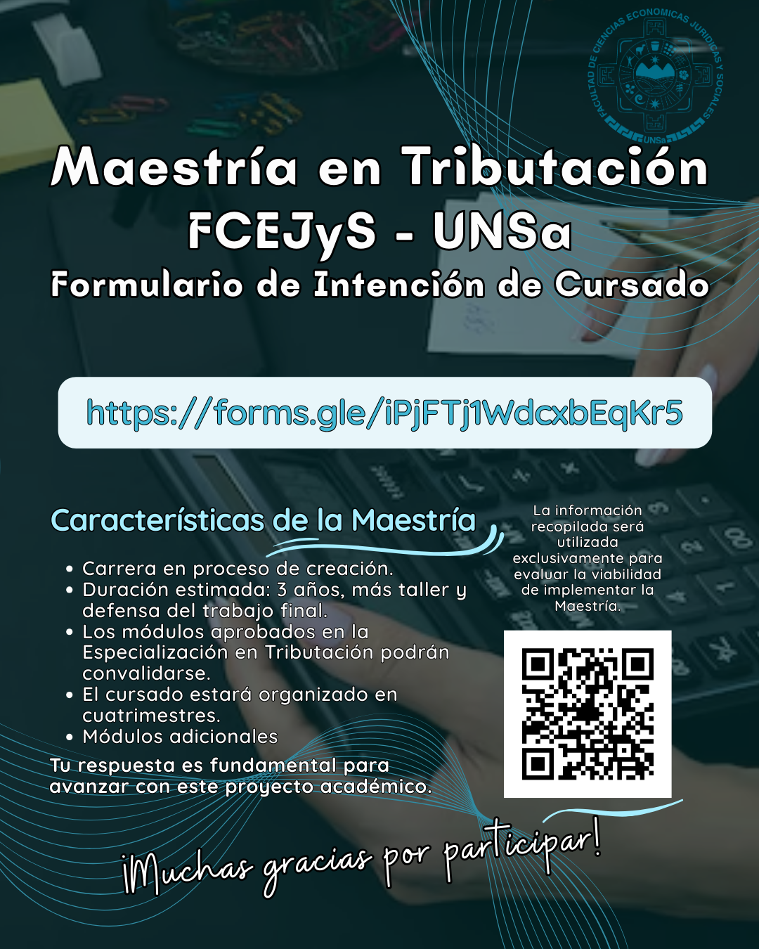 Desde la Dirección de Posgrado de la Facultad de Ciencias Económicas, Jurídicas y Sociales de la UNSa, invitamos a Contadores Públicos, Licenciados en Administración y Abogados a completar el siguiente Formulario de Intención de Cursado.