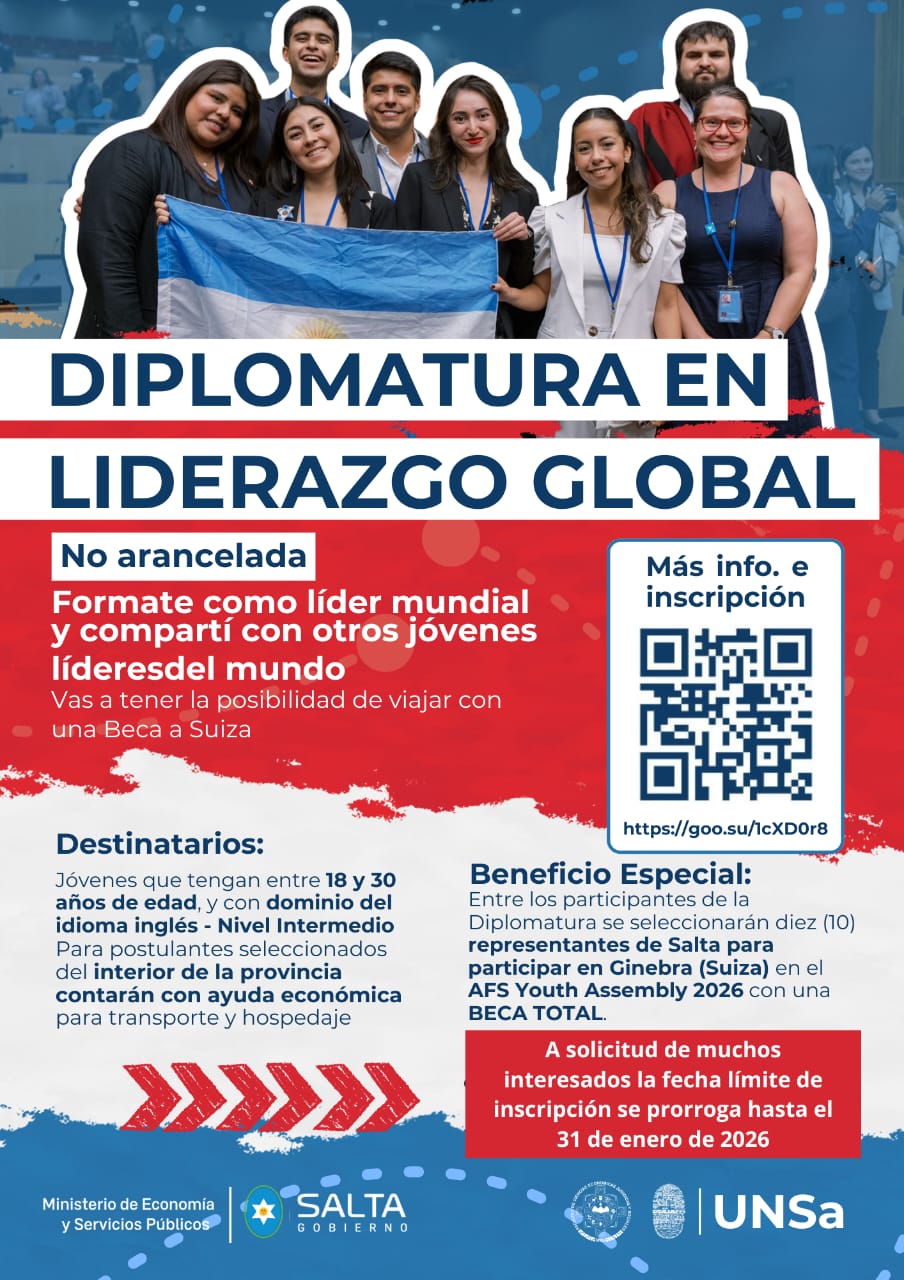 La Facultad de Ciencias Económicas, Jurídicas y Sociales de la Universidad Nacional de Salta junto al Ministerio de Economía y Servicios Públicos de la Provincia de Salta, han elaborado este programa de formación “Diplomatura de Extensión en Liderazgo Global” con el objetivo general de formar jóvenes líderes globales orientados a favorecer la configuración de una agenda internacional, con aptitudes para la comunicación efectiva, y destrezas para la generación de cambios locales y/o globales. Por ello se los entrenará para fortalecer sus habilidades de gestión, de liderazgo y de trabajo en equipo.