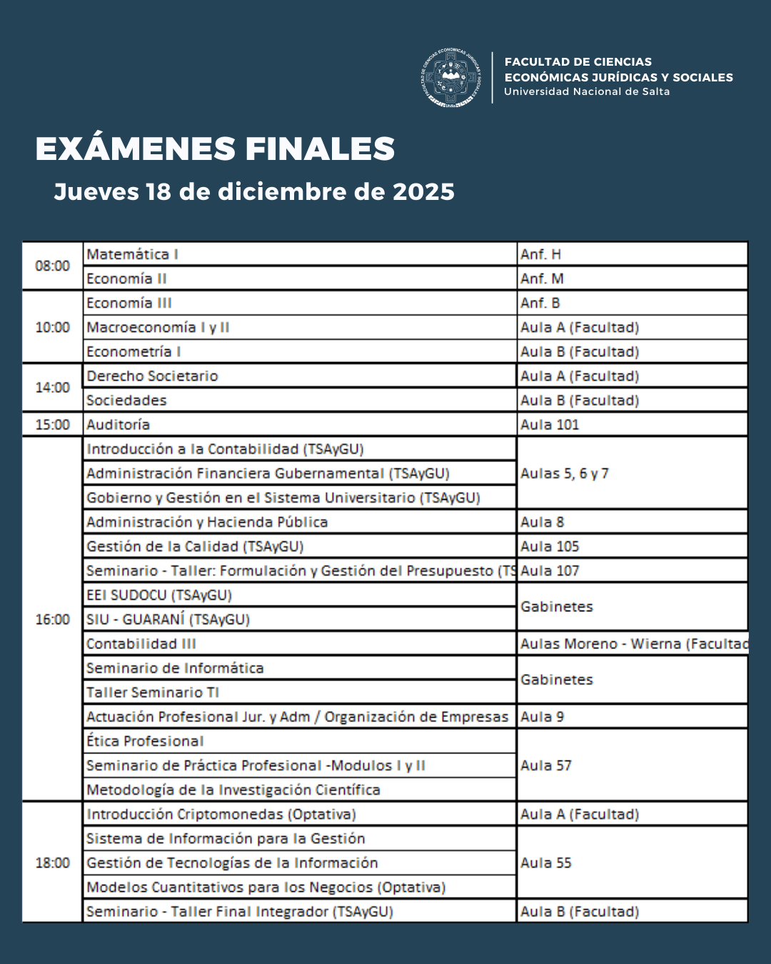 Las Autoridades de la Facultad de Ciencias Económicas Jurídicas y Sociales informan que, el día de mañana Jueves 18 de Diciembre, los exámenes se desarrollaran con total normalidad.