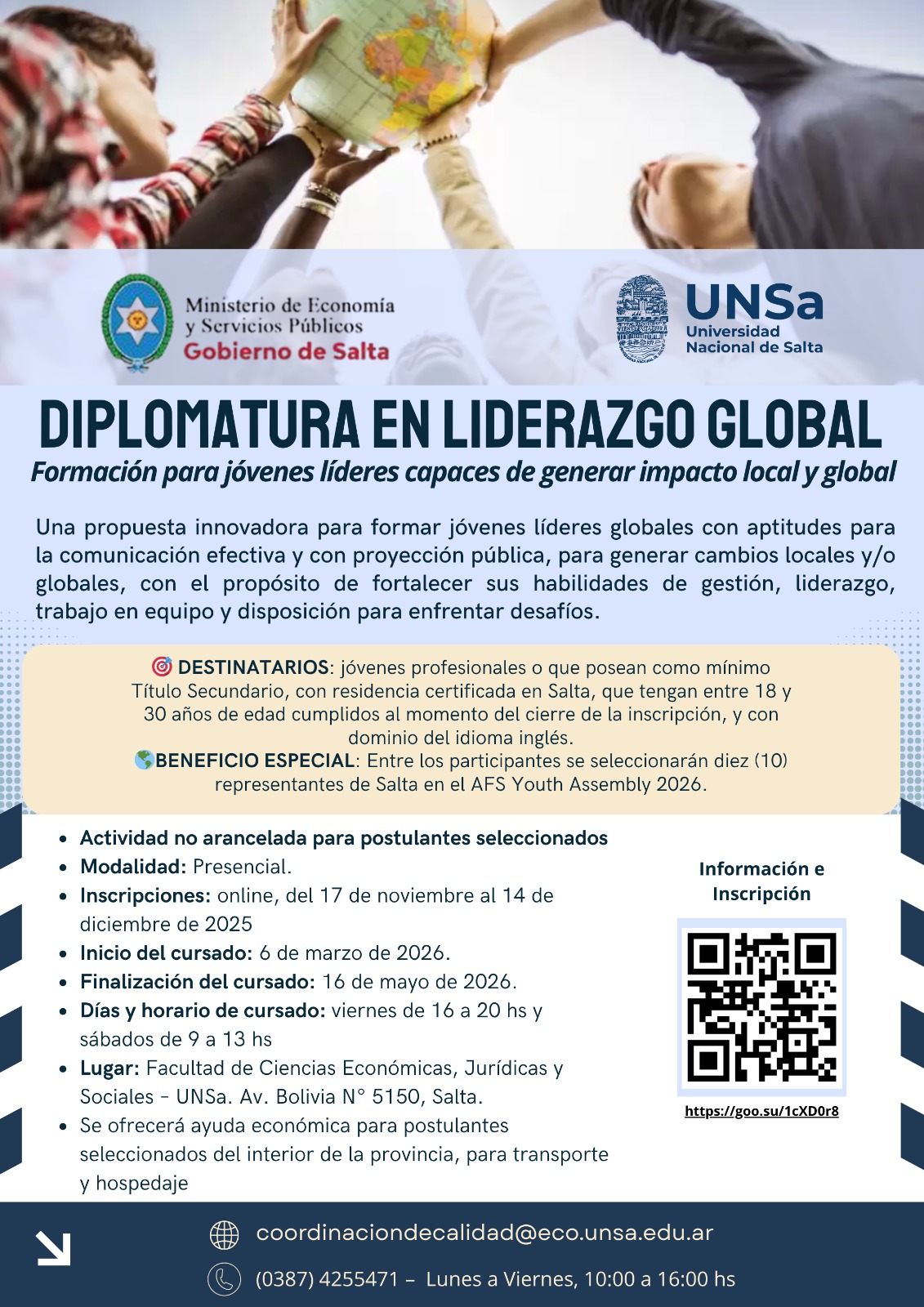 La Facultad de Ciencias Económicas, Jurídicas y Sociales de la Universidad Nacional de Salta junto al Ministerio de Economía y Servicios Públicos de la Provincia de Salta, han elaborado este programa de formación “Diplomatura de Extensión en Liderazgo Global” con el objetivo general de formar jóvenes líderes globales orientados a favorecer la configuración de una agenda internacional, con aptitudes para la comunicación efectiva, y destrezas para la generación de cambios locales y/o globales. Por ello se los entrenará para fortalecer sus habilidades de gestión, de liderazgo y de trabajo en equipo.