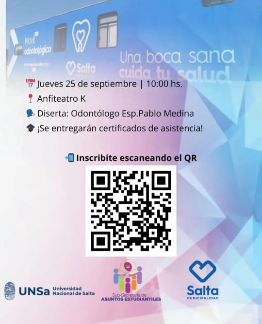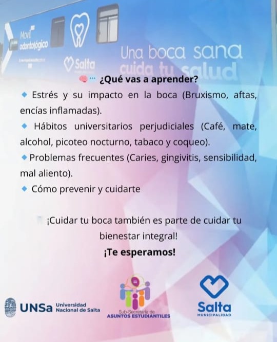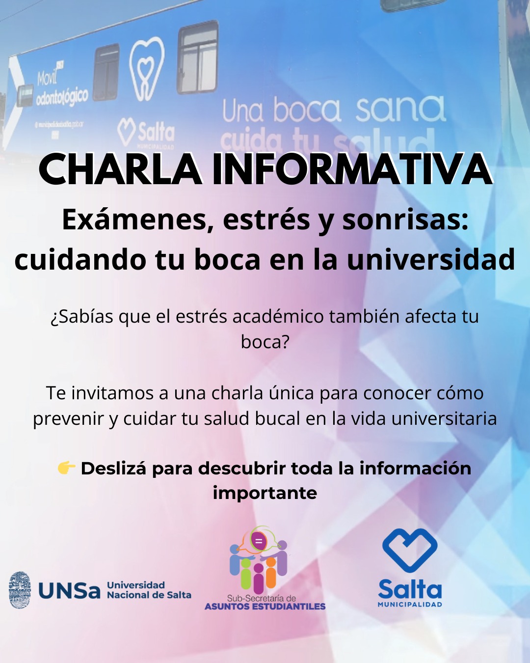 ✨ En el marco de la presencia del Móvil Odontológico en la UNSa. Te invitamos a participar de la charla informativa: "Exámenes, estrés y sonrisas: cuidando tu boca en la Universidad"