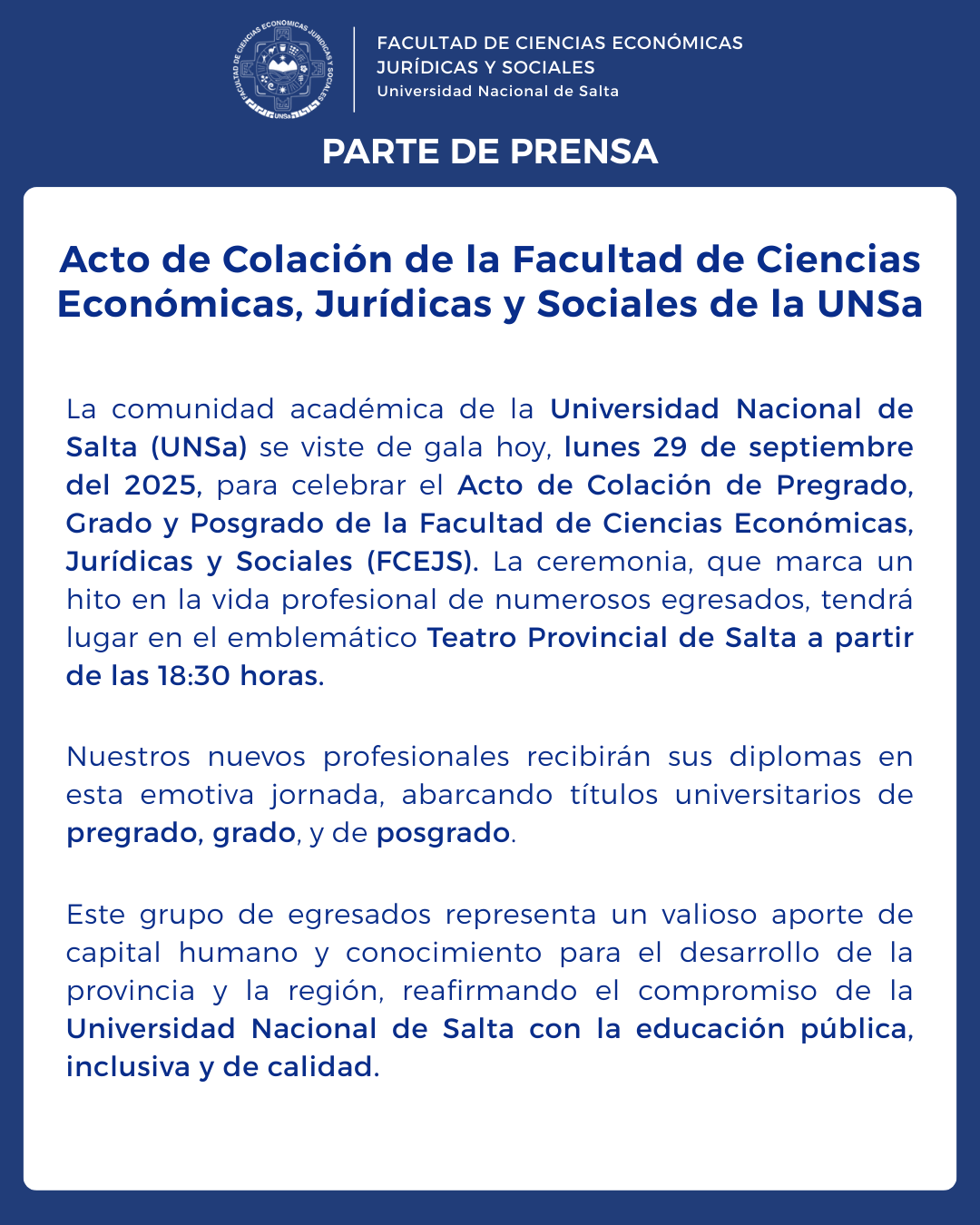 La Secretaría de Investigación y Extensión de la Facultad de Ciencias Económicas, Jurídicas y Sociales de la Universidad Nacional de Salta invita a toda la comunidad universitaria —estudiantes, graduados/as, docentes, personal de apoyo y autoridades— a participar en las 5° Jornadas de Investigación en Ciencias Económicas, Jurídicas y Sociales (JICES) y el 9° Encuentro de Innovación en la Enseñanza de la Red de Facultades de Ciencias Económicas del Norte Argentino.